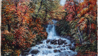 view of nature and waterfalls carpets, 50 Knots, Pile: Silk&merino, Warp: silk, dimensions 110x 62 cm(without frame),Texture: Tabriz