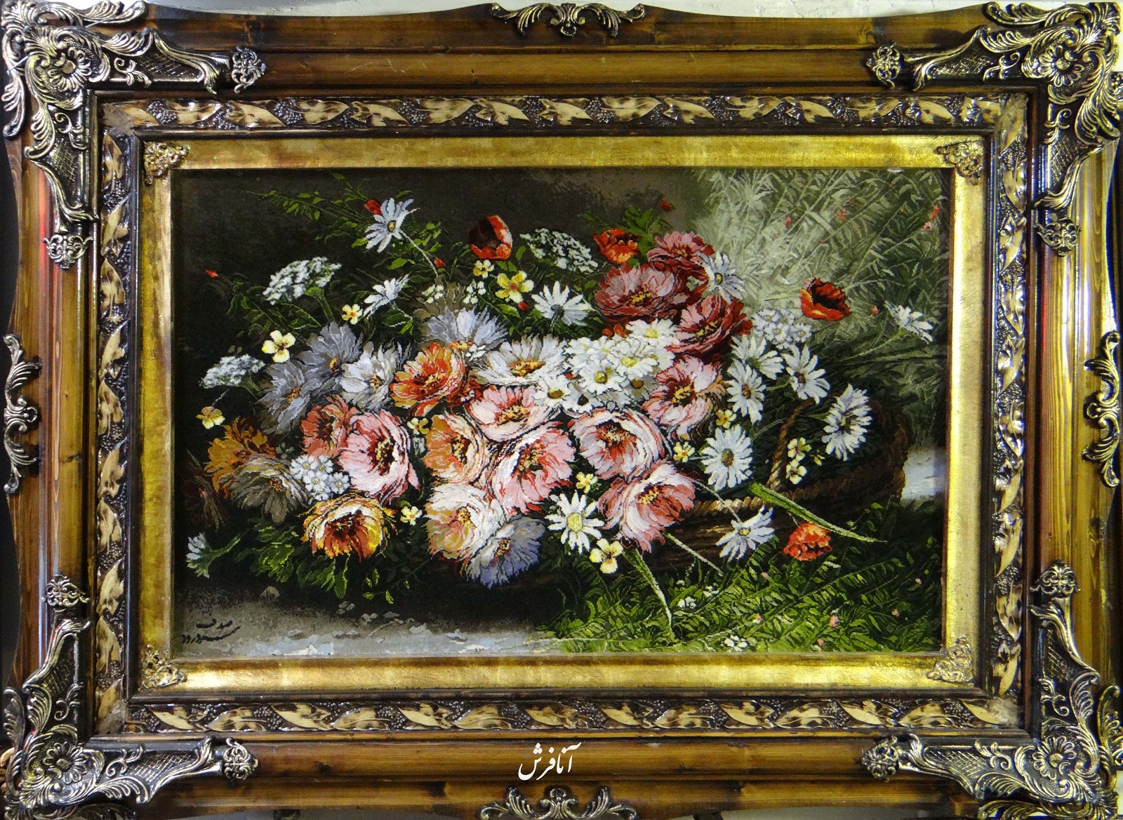 تابلوفرش گل, ریز تقریبی: 50 رج , جنس پرز: کرک و ابریشم, جنس چله : ابریشم , ابعاد (بدون قاب): 60*90 سانتی متر , محل بافت: تبریز- سردرود